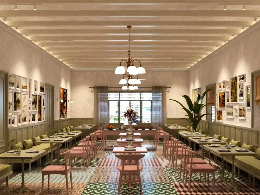 Mẫu thiết kế nhà hàng 200m² – Bụi tại Bình Thạnh, TP.HCM mang phong cách bán cổ điển, kết hợp hài hòa giữa nét sang trọng truyền thống và hơi thở hiện đại. Không gian nổi bật với các chi tiết phào chỉ tinh tế, nội thất gỗ ấm cúng cùng ánh sáng vàng dịu nhẹ, tạo cảm giác gần gũi và đẳng cấp. Cách bố trí thông minh giúp tối ưu diện tích, mang lại trải nghiệm ẩm thực thư thái, lý tưởng cho những buổi hẹn hò hay gặp gỡ bạn bè